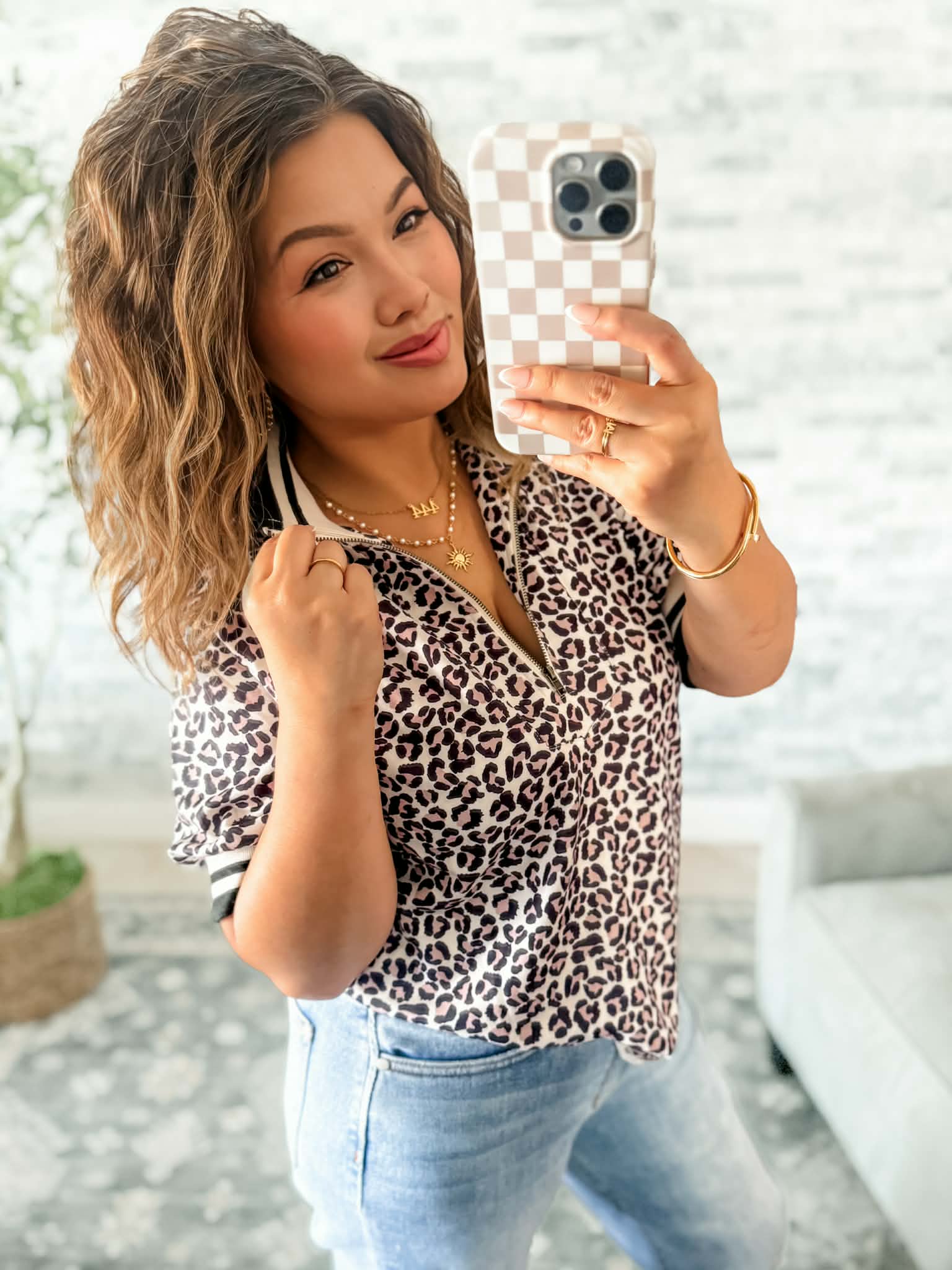 COLLARED LEOPARD TOP w/ ZIP FRONT